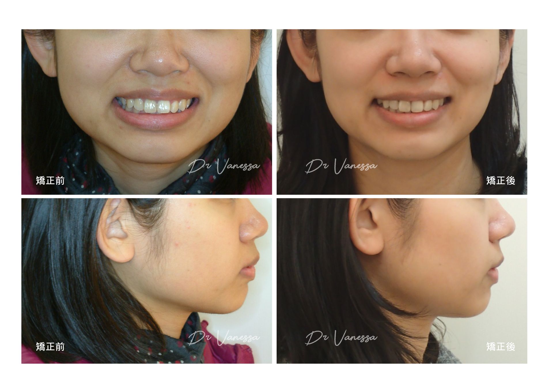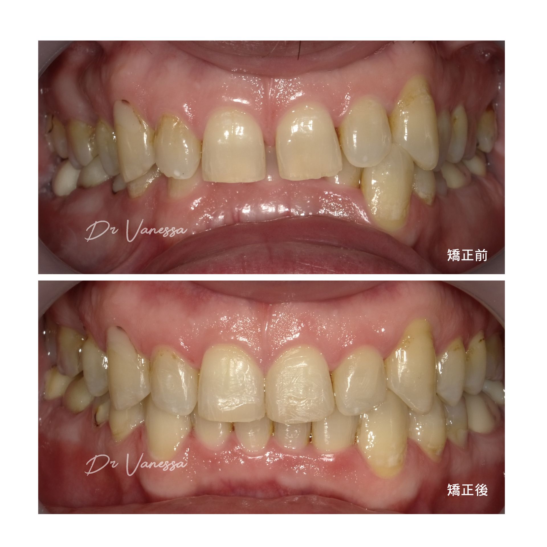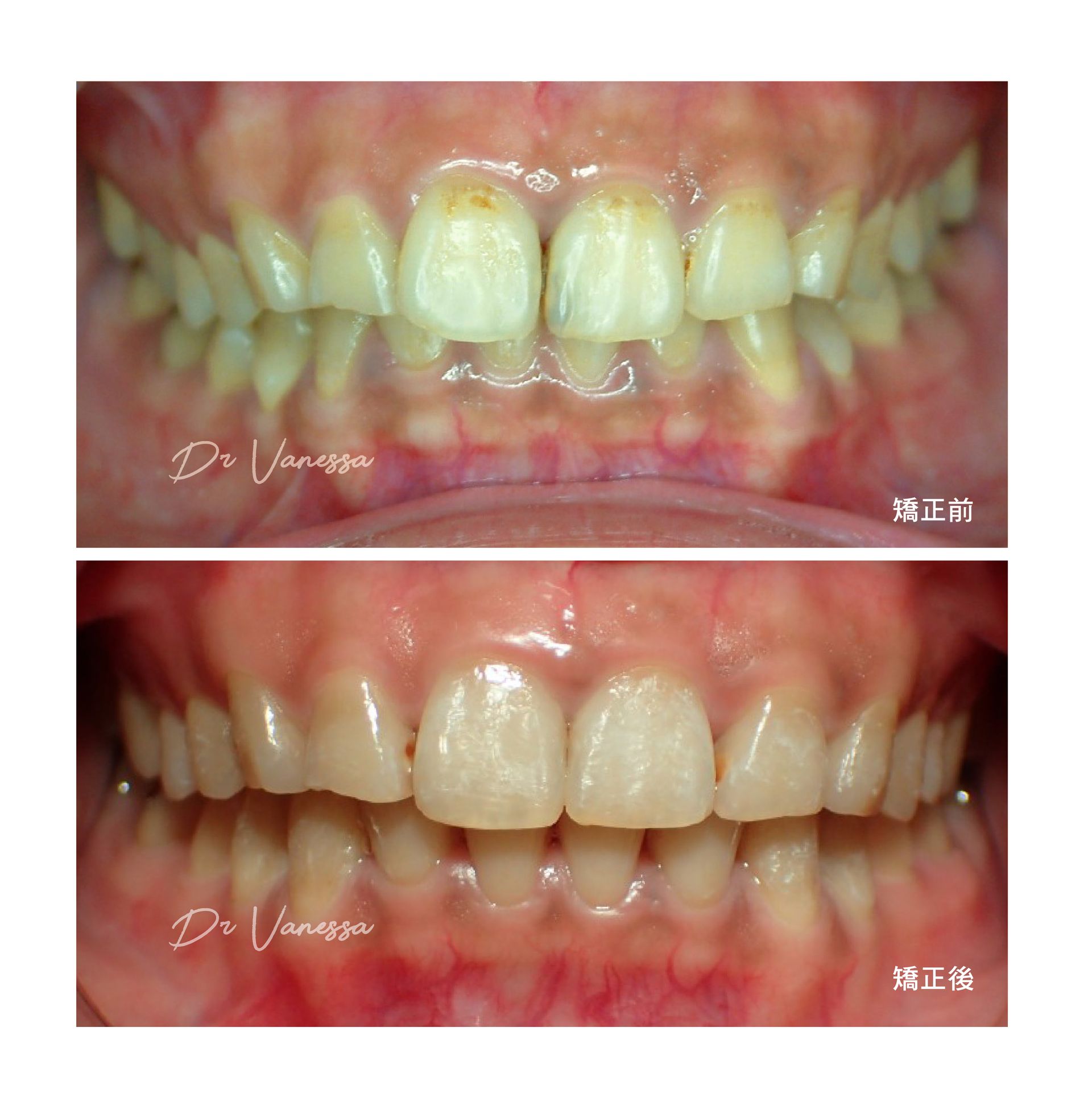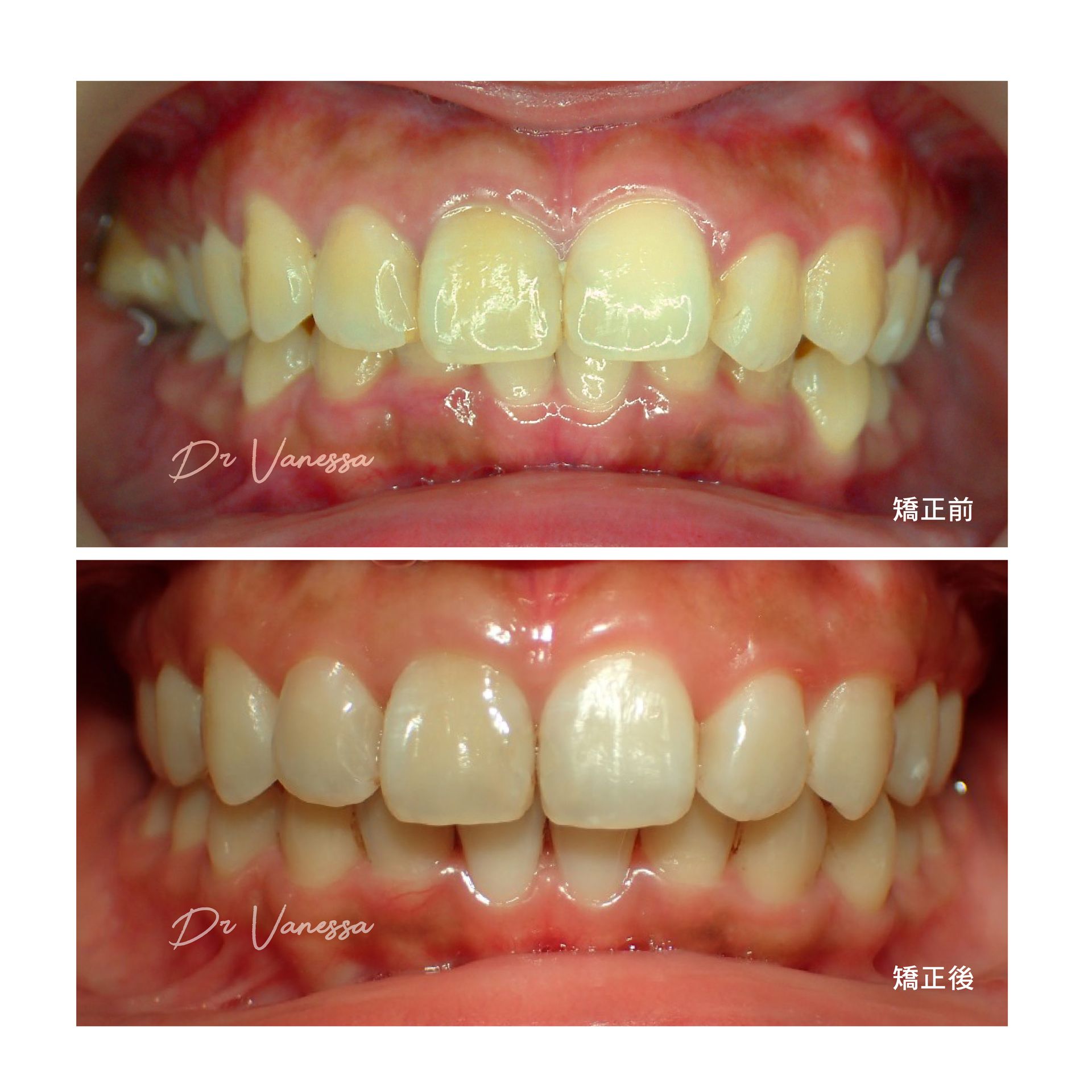 門牙歪斜加上咬合不正,應該會讓很多人不敢開懷大笑吧?F小姐就是這樣的例子!她一直覺得心裡很在意,直到她找到最好的解決方式,就是決心好好專心用一兩年的時間把門牙齒列矯正好。經過醫師精心的牙齒調整,不但門牙深咬的問題已完全改善,更因爲用隱形牙套成功的塑形牙弓,所以門牙調出的角度,連朋友都覺得很整齊漂亮啊!現在開朗自信的笑容就是她的最佳名片囉!