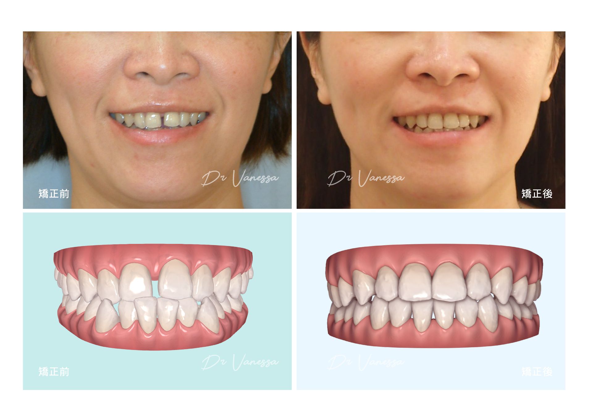 H小姐是專業的英文教師,流利的口語教學是她的專業,但是牙齒亂亂又有門牙開縫,是她一直覺得美中不足的地方,終於她選擇用隱適美隱形牙套來改善。
