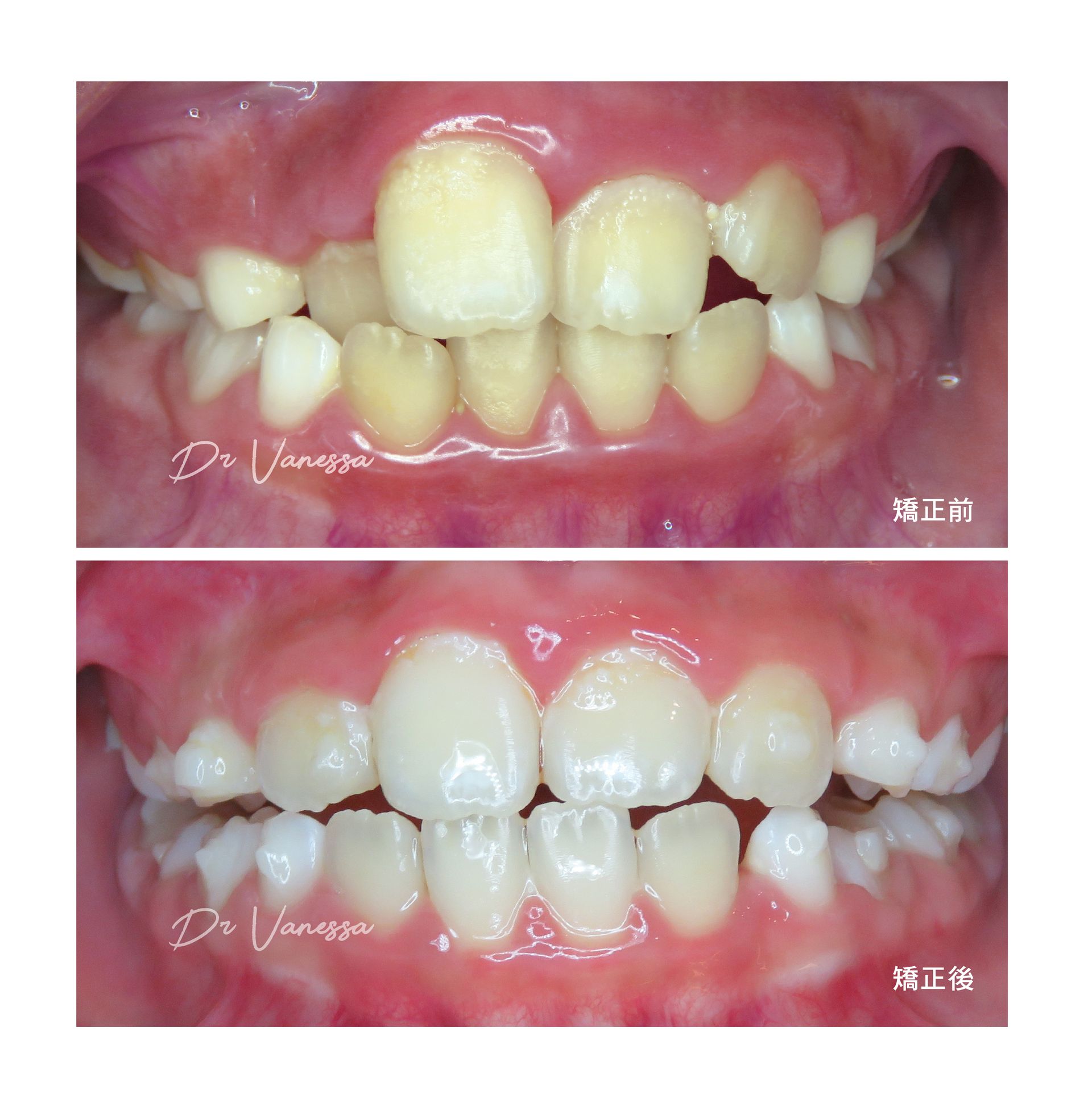 H弟弟有兩顆歪斜的兔寶寶門牙,一直讓他覺得很窘不敢笑,歪斜的牙齒更是難刷乾淨⋯⋯本來因為怕痛不敢矯正牙齒,醫師建議讓他可戴方便隱適美兒童牙套,牙套透明舒適美觀又方便,就不用戴著大鋼牙矯正器了!短短一年多,他的大門牙完全歸位排整齊,刷牙清潔沒有死角,也不容易再蛀牙了;現在小哥哥對自己更有自信,上台說唱表演都難不倒他了!
