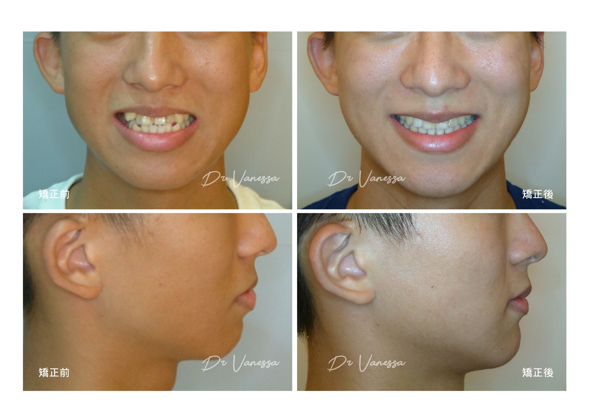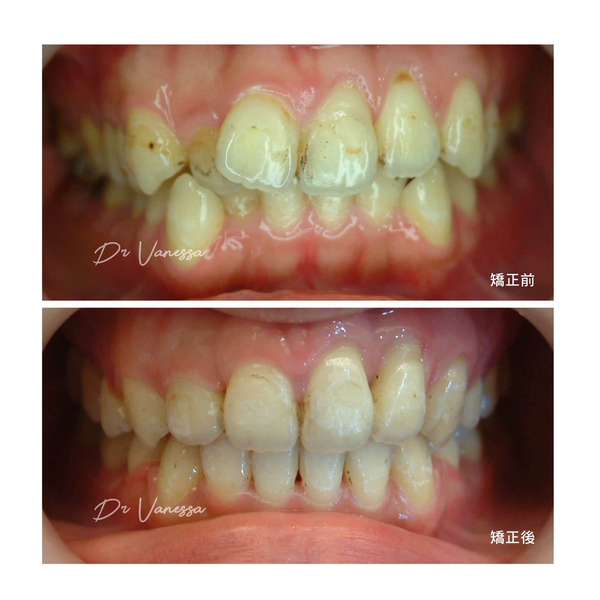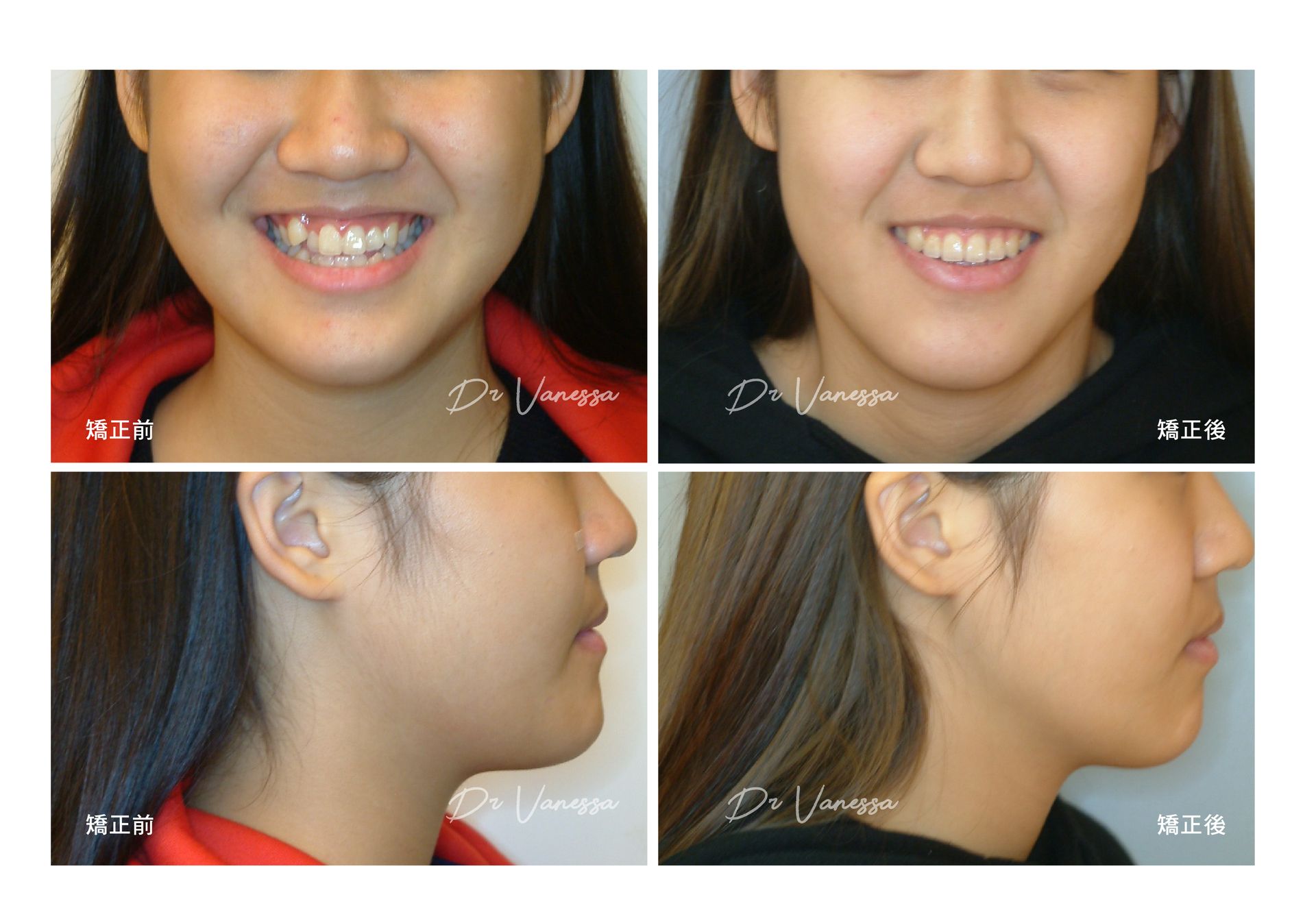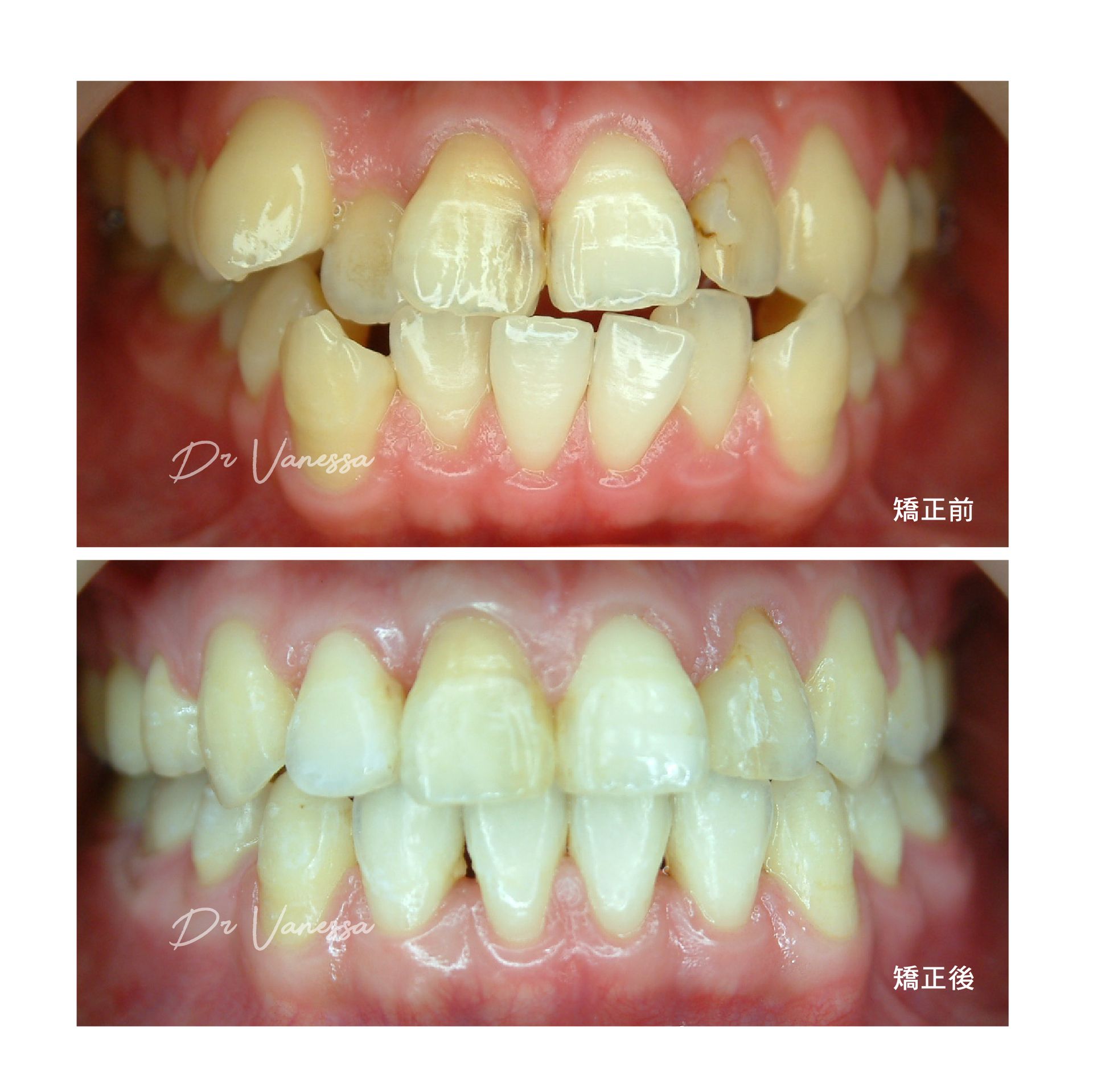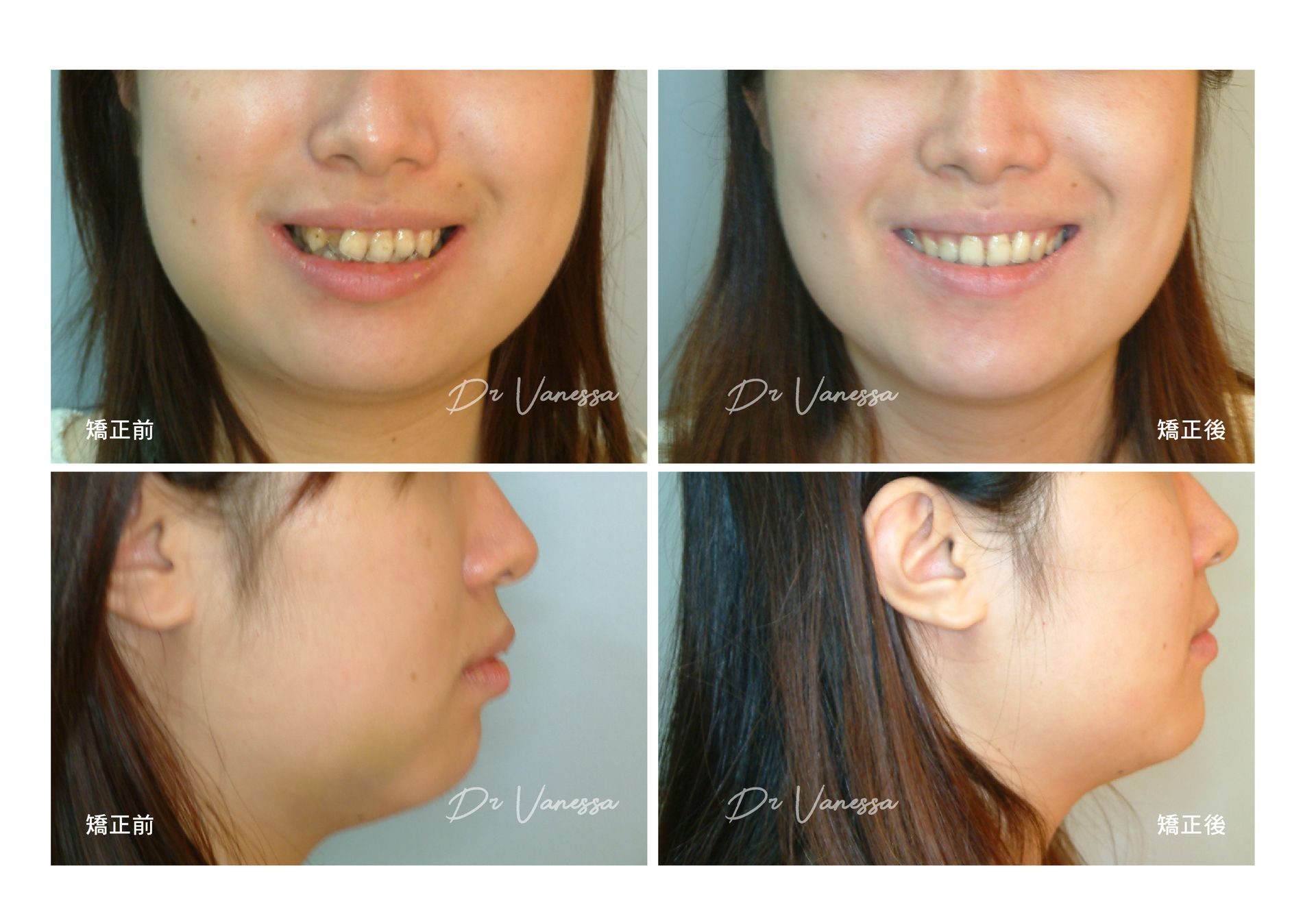 H小姐一直不喜歡她上下不乖外突的虎牙,常會一直咬到嘴唇呀⋯⋯自從做矯正把牙齒歸位後,不但尷尬的虎牙不見了,更明顯改善了原先前突戽斗的下巴!!