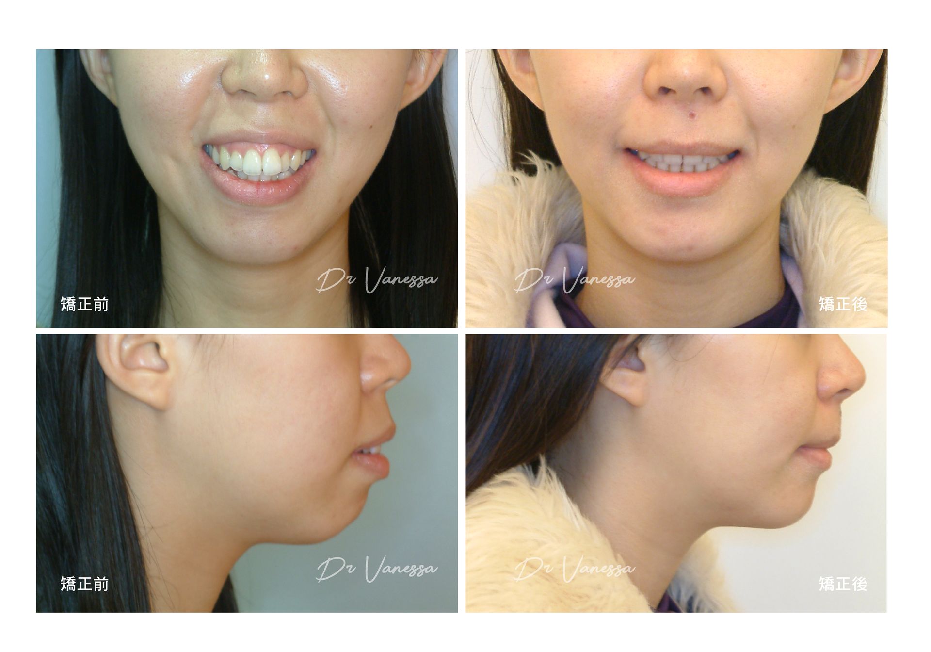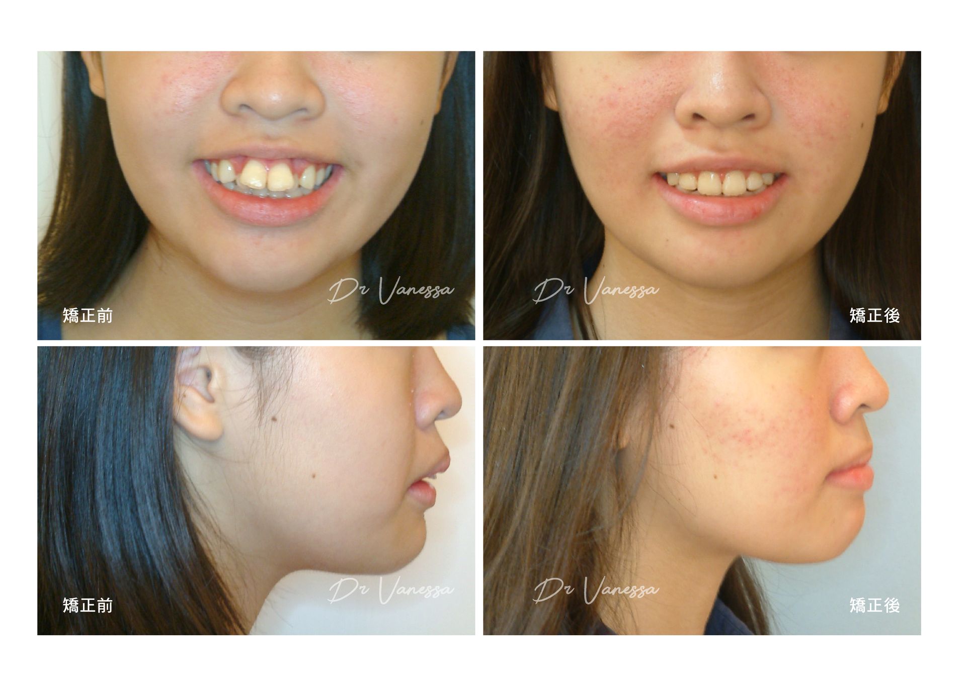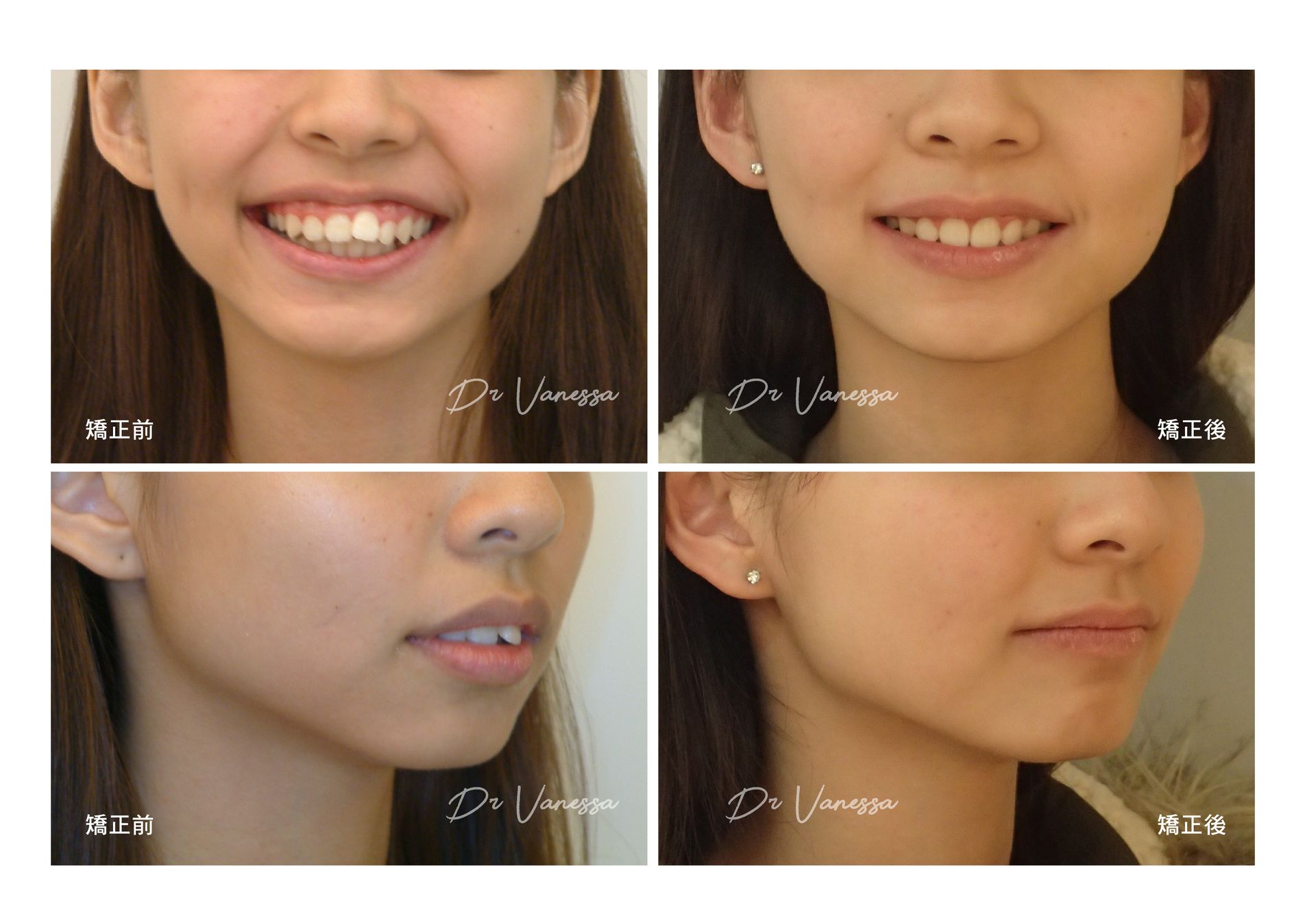H小姐是一個氣質OL, 雖有清秀五官的陪襯,但她很不喜歡自己的側面輪廓,尤其外突暴暴的嘴型和臉型!所以,她決定做齒顎矯正來打造一個全新的自己,經過二年多矯正的努力改造調整之後,不但得到一口氣質滿點的微笑曲線,最讓她滿意的,是原本外凸的嘴臉型竟然完全改善了!!現在清秀平順的側臉讓她的氣質大大加分,五官輪廓更顯得立體而有型,真的是華麗大轉身呢!